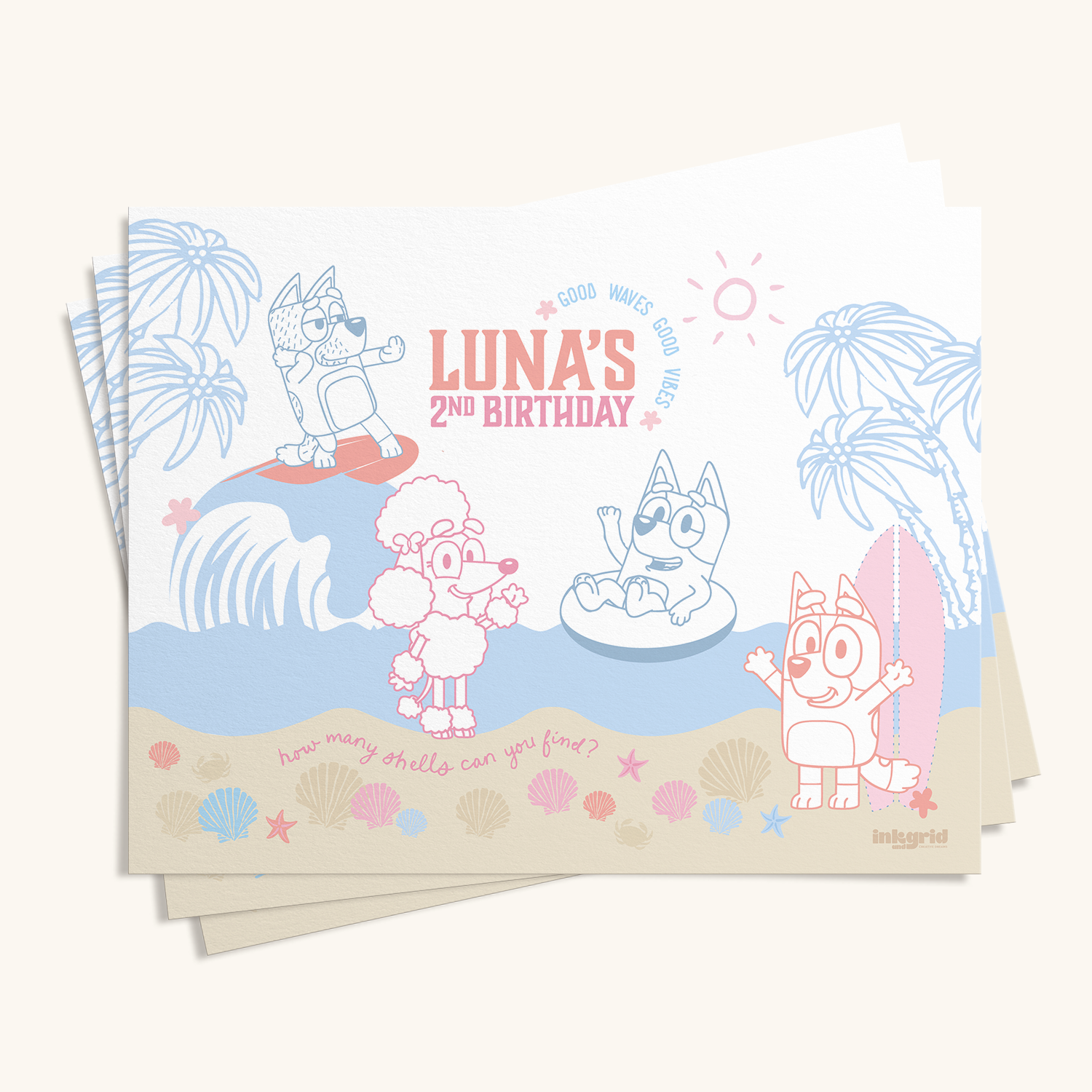 Inspired by sunny days and ocean waves, this Bluey Surf Activity Placemat brings a relaxed, coastal twist to your celebration. Designed in a clean and modern style with playful beach details.