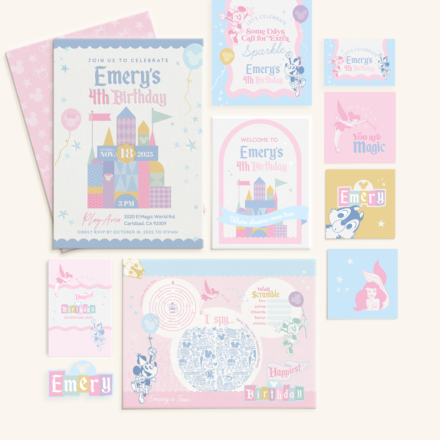 This Disneyland-inspired bundle captures the magic of childhood in soft pastels and playful castle details. Designed to make your little one’s celebration feel straight out of the happiest place on earth, it blends whimsy, color, and nostalgia in every detail. Perfect for any child who loves fairy tales, magic, and adventure!