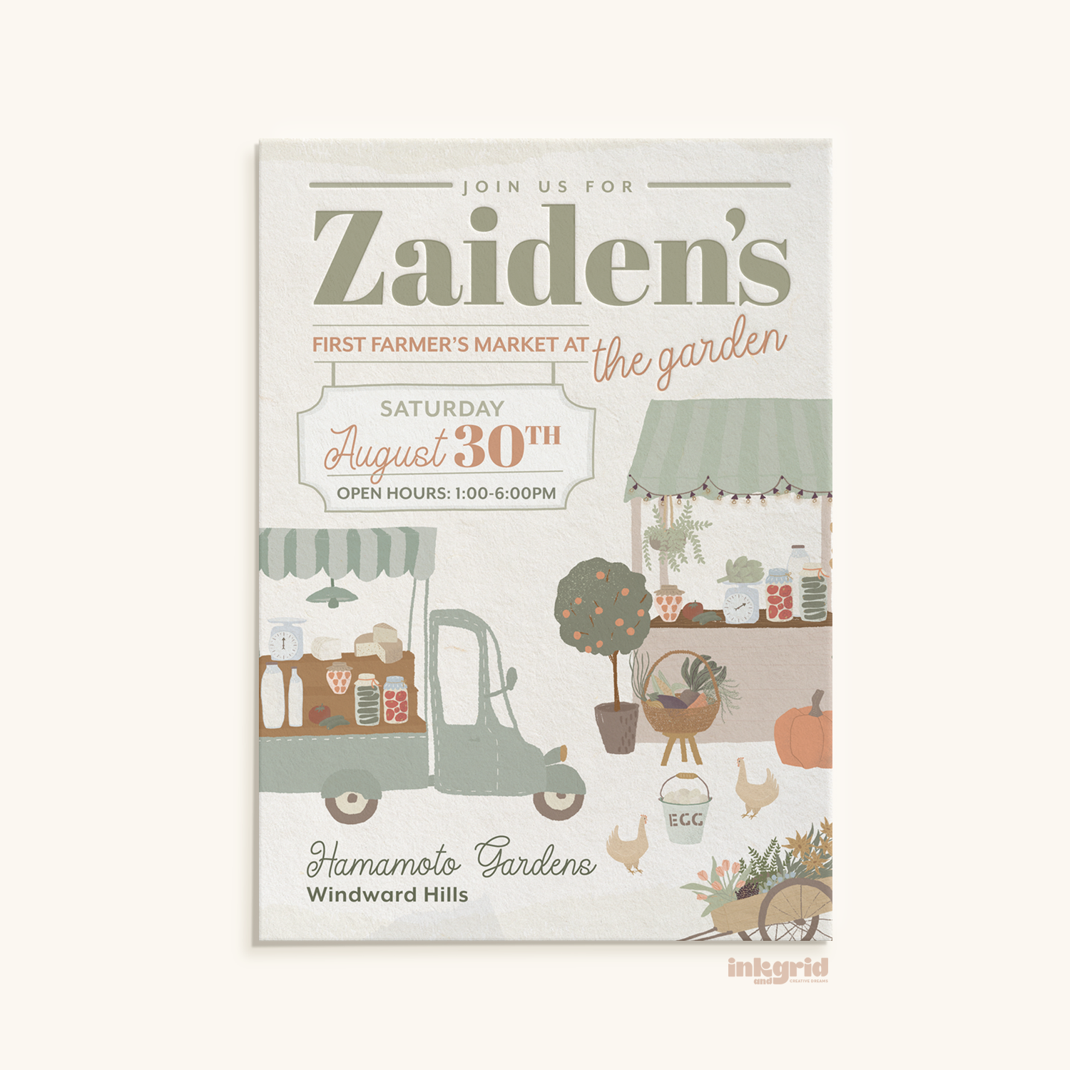 This Farmer’s Market–inspired invitation is the sweetest way to invite guests to your little one’s celebration. Designed with soft pastel tones, hand-drawn produce stands, and cozy farm details, it captures that perfect blend of rustic charm and playful elegance.