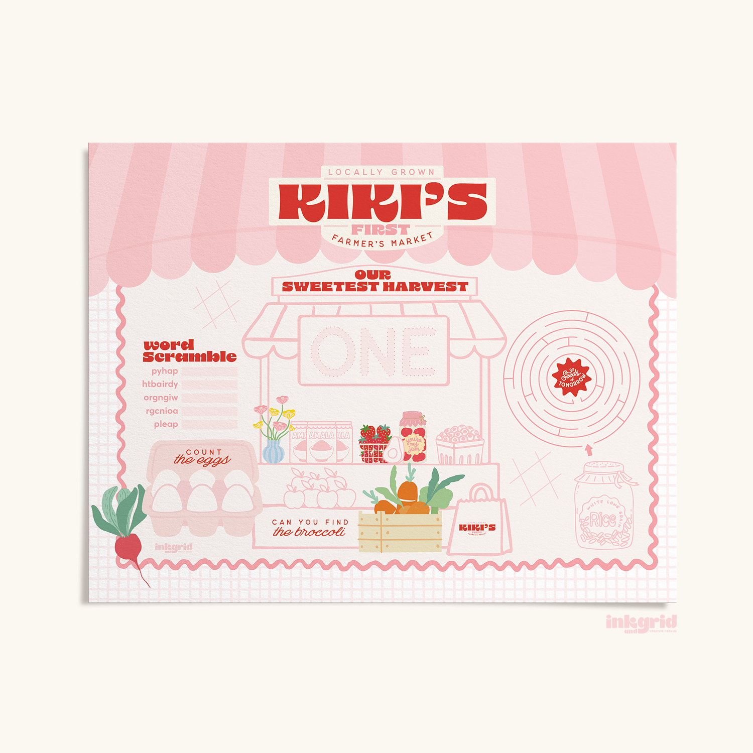 • 1 personalized Farmers Market activity placemat - Letter Size (8.5x11)