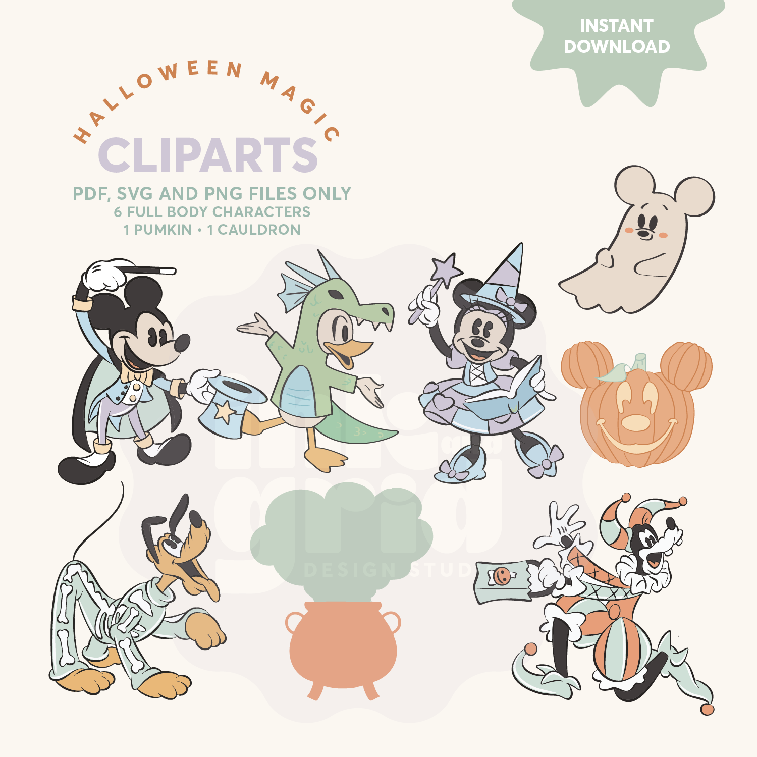 Bring a dash of Halloween fun, without the fright! This Not-So-Spooky Halloween Magic clipart set includes your favorite classic characters dressed in pastel costumes, ready to add a playful touch to your creative projects. Featuring 6 full-body characters, 1 pumpkin, and 1 bubbling cauldron, all in PDF, SVG, and PNG formats for easy use.